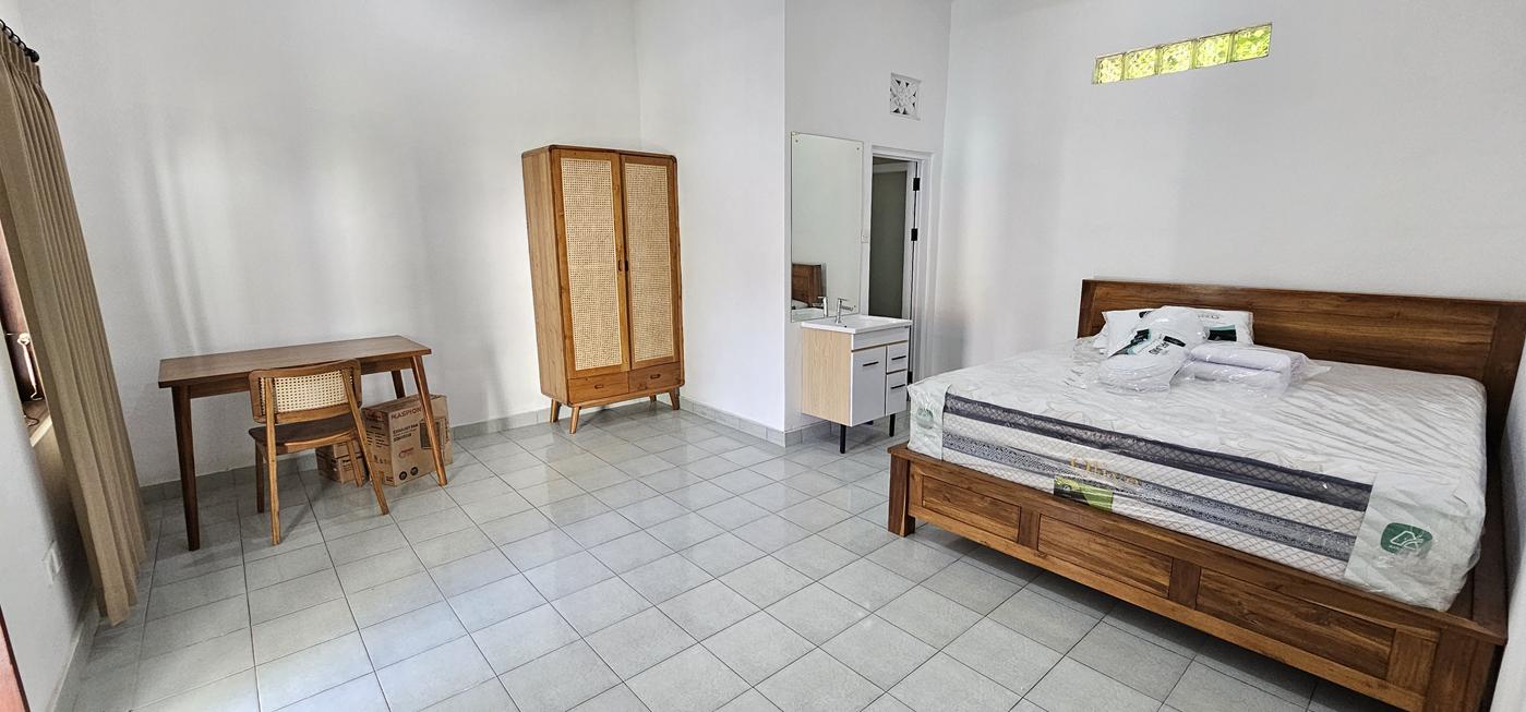 The bedrooms are well-sized, each with ensuite bathrooms and bathtubs for added comfort. The open-plan kitchen comes with essential equipment, including a stove and refrigerator, ensuring everyday practicality. This long term rental villa also has air conditioning, a carport, and 5500 watts of electrical power to support modern living.