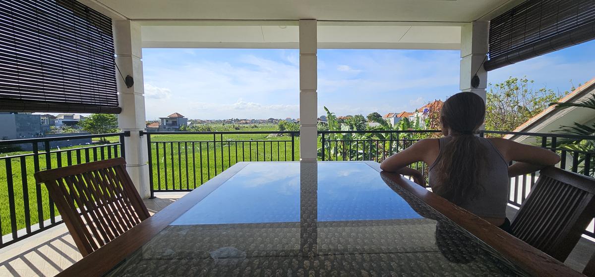 Rooftop lounge with unobstructed rice field views