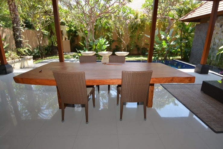 There is a large patio featuring a dining table for those who prefer to dine outdoors or simply want to relax by the overflow swimming pool. The patio is set with sunbeds, and the garden has colorful flowers, plants and Palm trees.