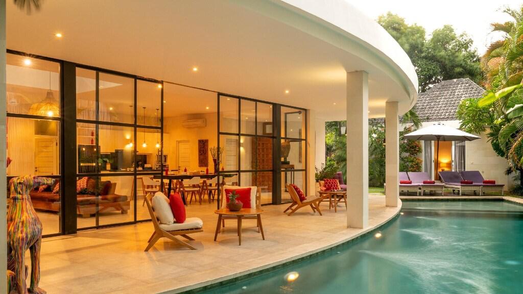 Located in Seminyak this 4-bedroom villa has a living room with lots of natural light and a great swimming pool.