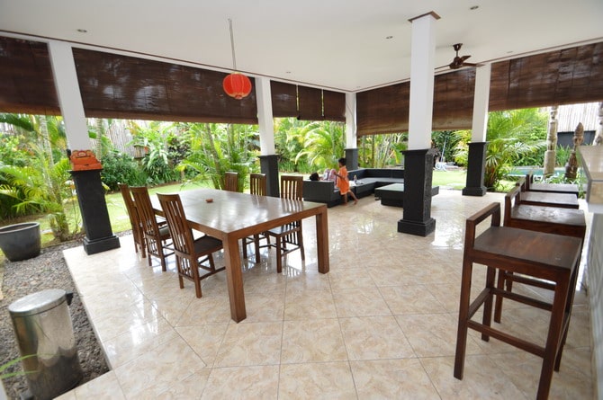 Also there is a spacious patio with a dining table for those who prefer to eat outside or simply want to relax by the large swimming pool.
